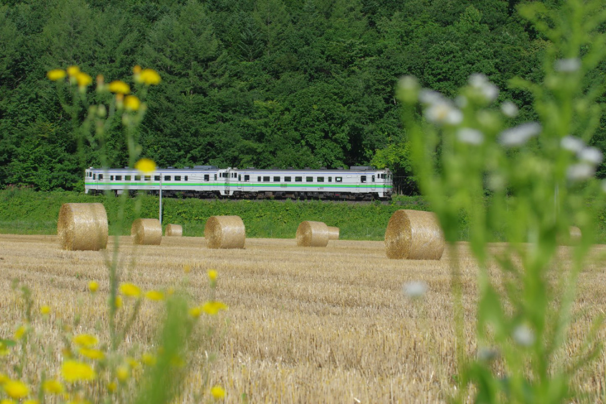 道東の鉄旅の魅力は、海岸線沿いだけとは限りません。オホーツクの平野を走る列車を、酪農地帯のシンボル「牧草ロール」がお出迎え。フラットな視線で探してみると、鉄路のちょっとしたところに絵になる「北海道らしさ」を見つけることができます。