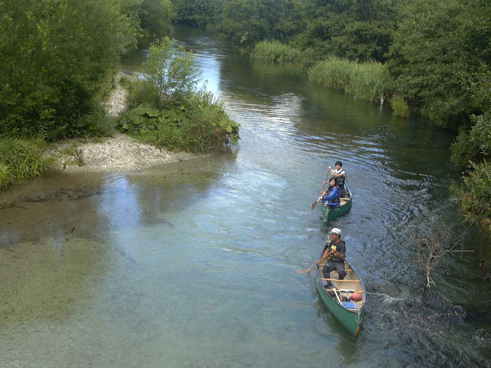 - 自分の手でパドルを握り、カヌーを操作し、川を下るカヌーツアーを行っています。始めに湖でカヌーの動かし方などをじっくり練習してから川を下ります。ガイドは同乗せず、別のカヌーで一緒に行きます。カヌーに乗ったことのない方、大歓迎ですよ♪