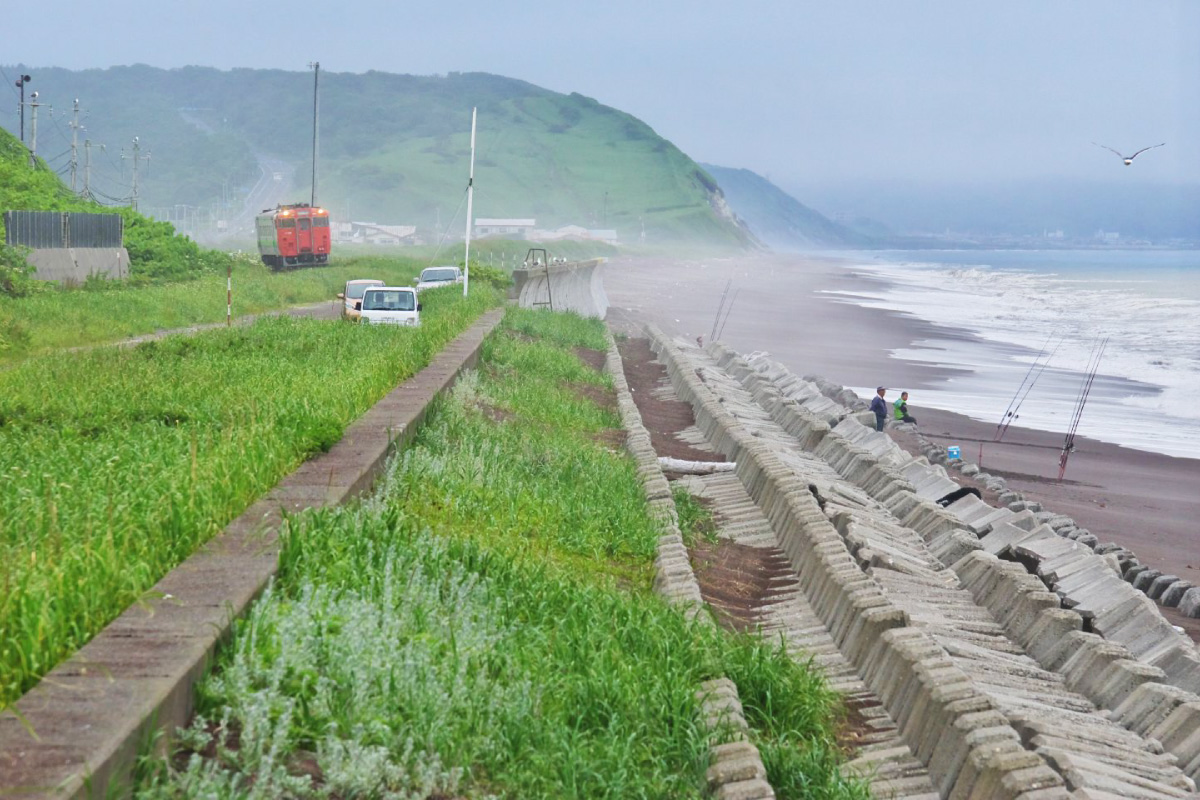 釧路に向かって右手に広がる太平洋の青と、パシクル湿原の緑。根室本線の尺別駅〜音別駅〜古瀬駅にかけては「乗ってよし」「撮ってよし」の絶景エリアです。このような湿地帯は道路が近くにないので、大自然の中をゆく列車をカメラに収められますよ。